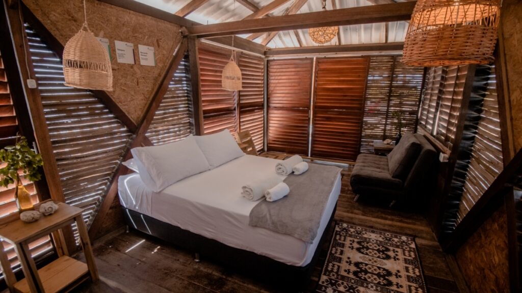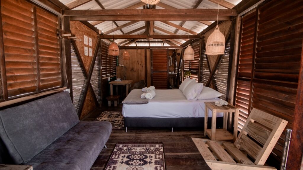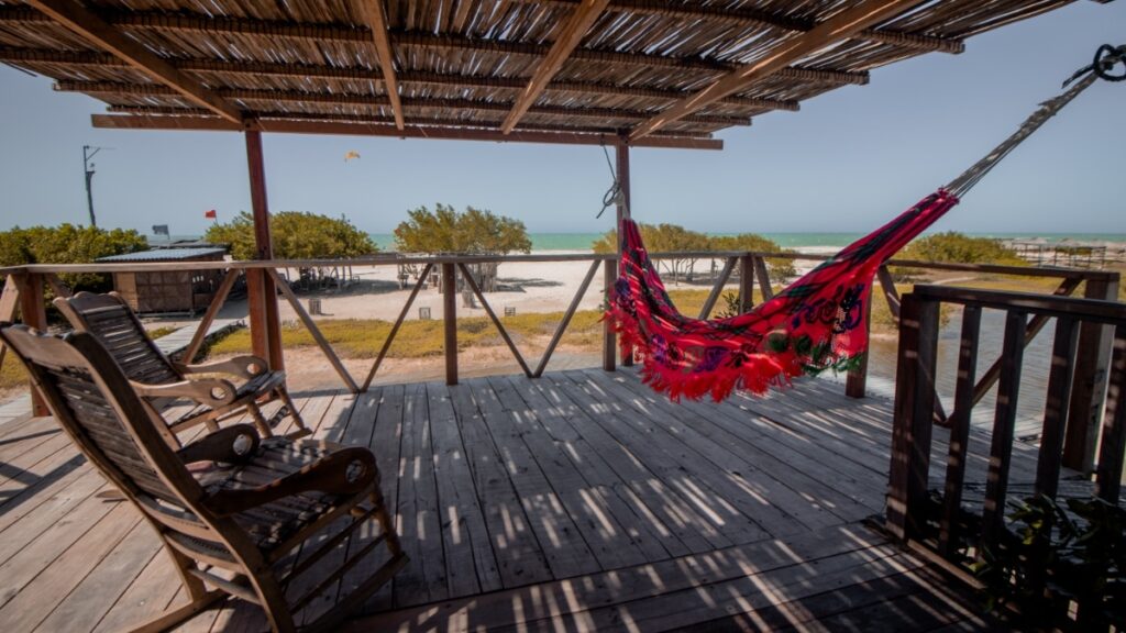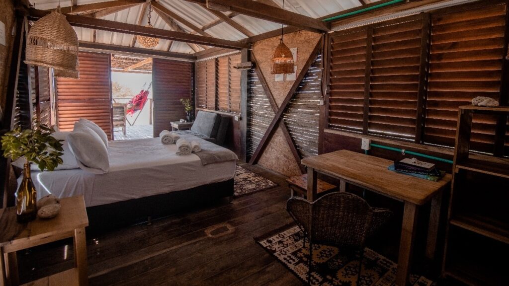 Esta es la habitación. Frente al mar, con una terraza de 4 metros donde todo fluye: el viento, las cometas, el sol naciendo y el día despidiéndose. Aquí te llega la brisa directa, sientes el alma del lugar, el sonido del oleaje, la libertad. Tiene cama doble, sofá chill, escritorio para los que viajan con ideas, baño privado y espacio para dejar tus cosas sin complicarte. Si vienes en pareja, te vas a enamorar más. Si vienes solo tendrás un espacio de reconexión contigo mismo que vas a amar.